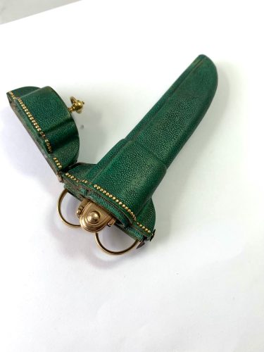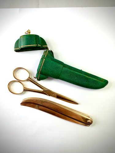 Florence ca 1760 solid gold pair of scissors and solid gold fruit knife in original gold decorated shagreen case