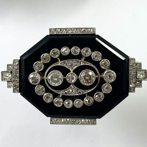 Ca 1930 fully hallmarked French platinum brooch with onyx and diamonds